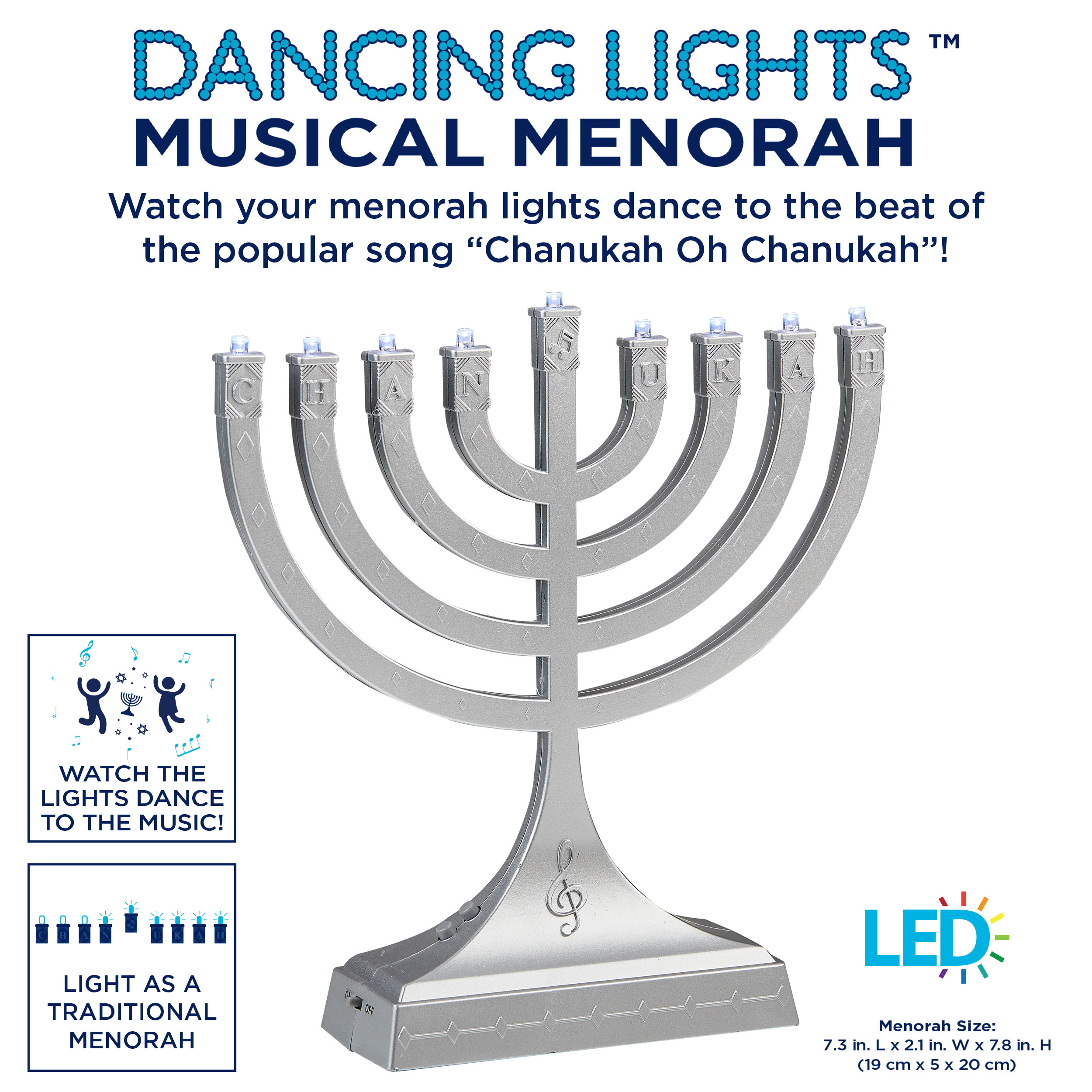 Experience the Dancing Lights™ Musical Menorah! Not only does this marvelous silver electric menorah light as a traditional Chanukah Menorah, but it also plays music while the lights "dance" to the beat! With three easy options to power—AC adapter, micro USB, and battery—you will be singing and dancing for all eight days of Chanukah!